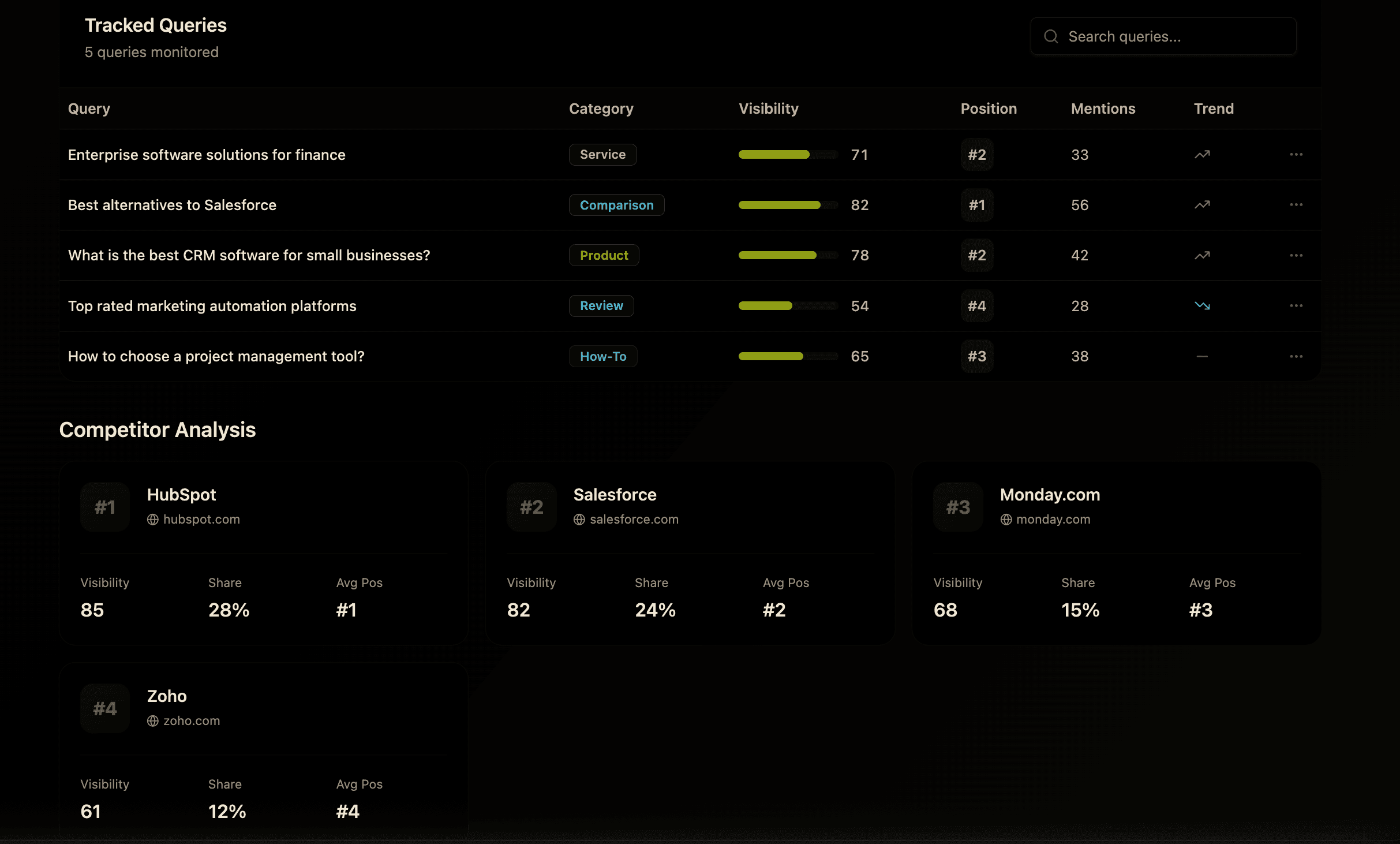 We monitor high-intent prompts across service, comparison, product, review, and how-to categories, showing visibility score, average position, total mentions, and trend for each query. This reveals which questions AI systems already associate with your brand—and where you’re one step away from owning the answer.