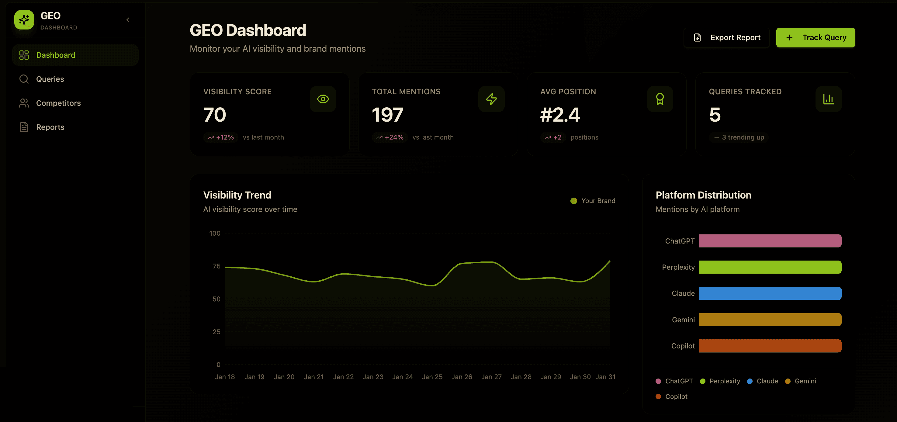 We track how often your brand is mentioned, where it appears in AI-generated answers, and which platforms are driving that visibility—including ChatGPT, Perplexity, Claude, Gemini, and Copilot. Instead of rankings and clicks, GEO measures inclusion, positioning, and momentum inside AI responses.